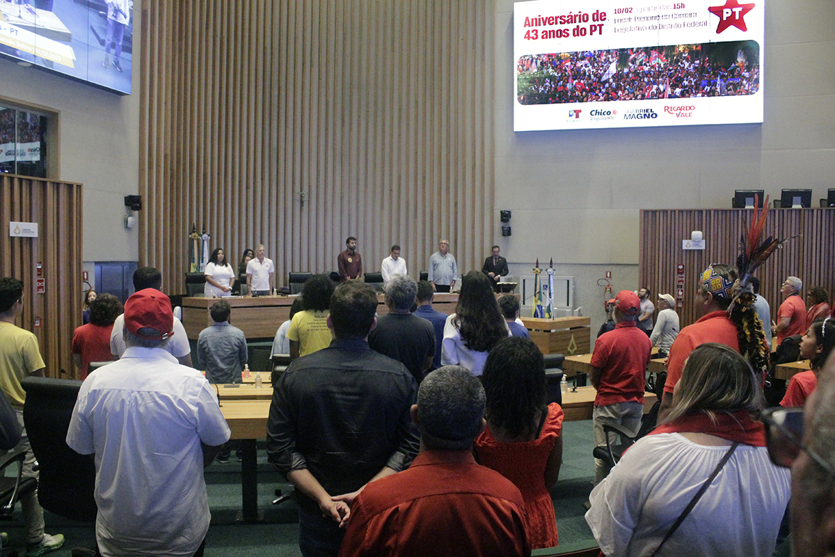 Na tarde desta sexta-feira (10), a Câmara Legislativa comemorou os 43 anos do Partido dos Trabalhadores (PT) em sessão solene, transmitida ao vivo pela TV Câmara Distrital (canal 9.3) e YouTube. A homenagem, proposta pelos deputados que compõem a bancada do PT na CLDF, Chico Vigilante, Gabriel Magno e Ricardo Vale, reuniu expoentes e militantes partidários no plenário da Casa.